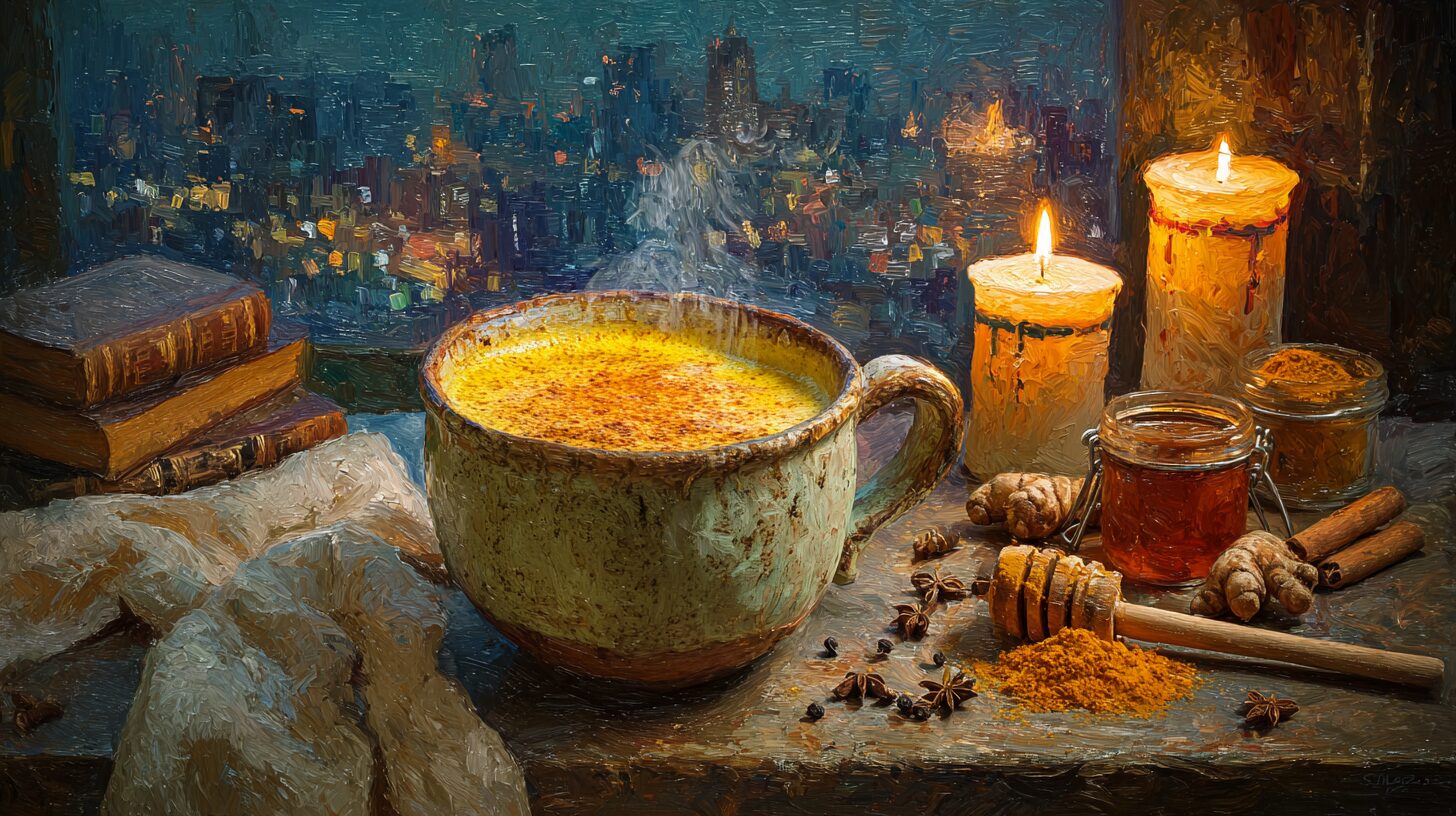 黄金色のラテを一口飲めば、
